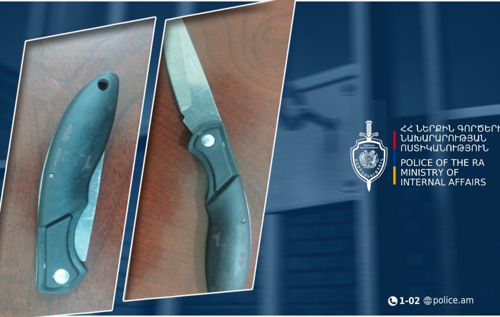 ՆԳՆ ոստիկանությունից տեղեկացնում են, որ համայնքային ոստիկանության Չարենցավանի բաժնի ծառայողները ձեռնարկած օպերատիվ-հետախուզական միջոցառումների արդյունքում հոկտեմբերի 14-ին Չարենցավան քաղաքի 3-րդ թաղամասի շենքերից մեկի մոտ հայտնաբերել, սառը զենք պահելու կասկածանքով ձերբակալել և բաժին են տեղափոխել 15-ամյա մի պատանու: Նրա անձնական խուզարկությամբ հայտնաբերվել է ծալովի դանակ:
