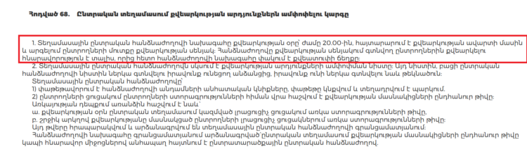 ՀՀ ընտրական օրենսգրքի 68-րդ հոդվածը սահմանում է, որ հանձնաժողովի նախագահը միայն փակում է քվեատուփի ճեղքը, խոսք չկա թել անցկացնելու կամ թելը կապելու մասին։