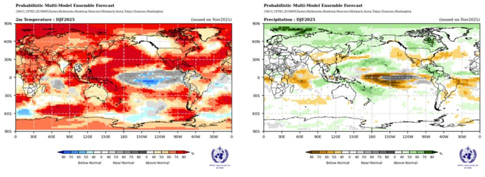 ՀՕԿ-ի բազմամոդելային կանխատեսումները 2025-2026 թվականների ձմռան համար ցույց են տալիս, որ աշխարհում զգալիորեն բարձրացել է ցամաքի մակերևույթի միջինից բարձր ջերմաստիճանների հավանականությունը։ Միջինից բարձր ջերմաստիճանների բարձր հավանականություն է կանխատեսվում Հյուսիսային Ամերիկայի հարավային և հյուսիսարևելյան շրջանների, Կենտրոնական Ամերիկայի, Կարիբյան ավազանի, ինչպես նաև Հյուսիսային բևեռային շրջանների համար։ Հարավային կիսագնդում նման պայմաններ առավել հավանական են Նոր Զելանդիայում և Հարավային Ամերիկայի հարավում, իսկ Ավստրալիայում նկատվում է այդ հավանականության համեմատաբար թույլ աճ։