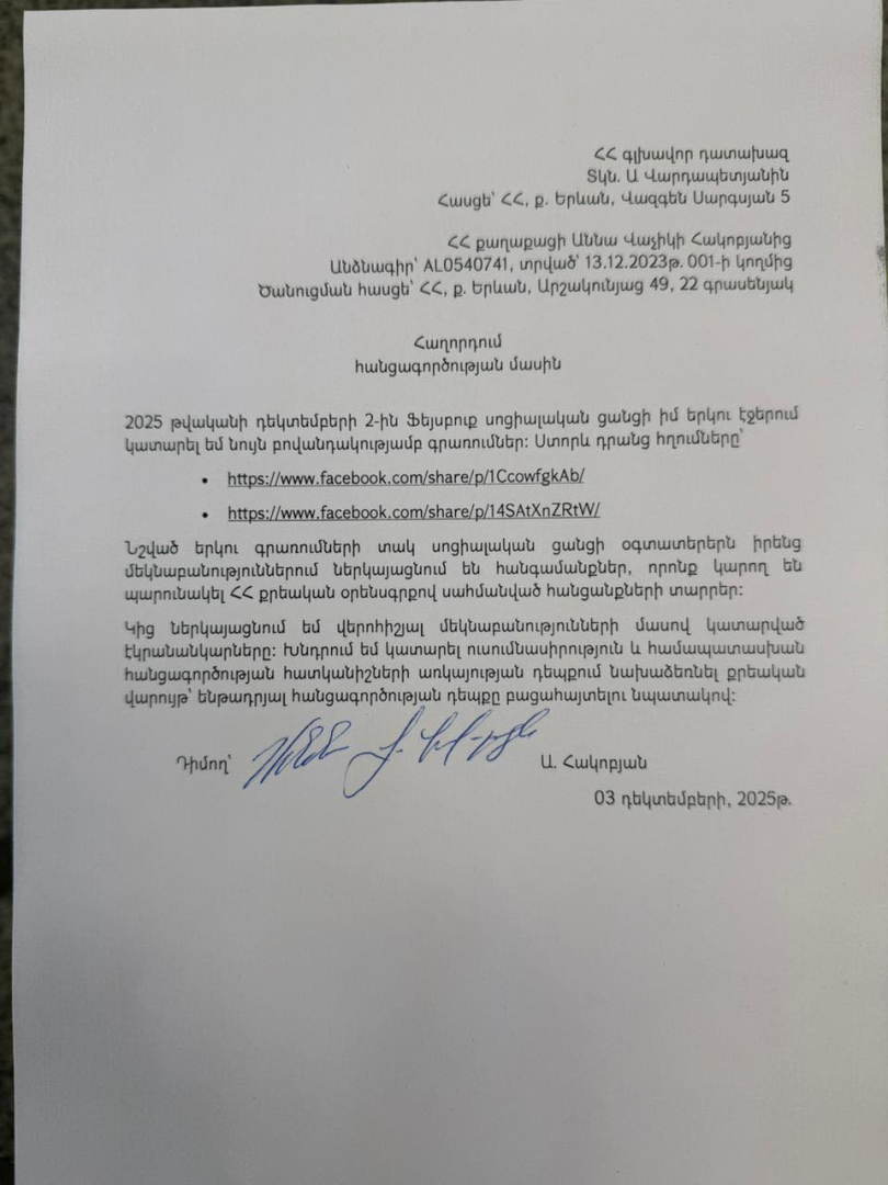 Այս առիթով այսօր դիմում եմ ներկայացրել ՀՀ գլխավոր դատախազին` խնդրելով սահմանված կարգով քննել նշված ահազանգերը։