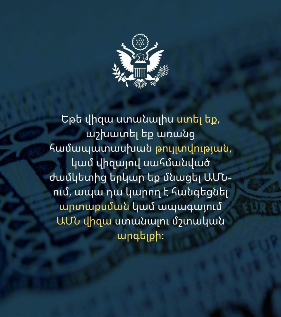 Եթե վիզա ստանալիս ստել եք, աշխատել եք առանց համապատասխան թույլտվության կամ վիզայով սահմանված ժամկետից երկար եք մնացել ԱՄՆ-ում, ապա դա կարող է հանգեցնել արտաքսման կամ ապագայում ԱՄՆ վիզա ստանալու մշտական արգելքի։ Այս մասին հայտնում են ՀՀ-ում ԱՄՆ դեսպանատնից: