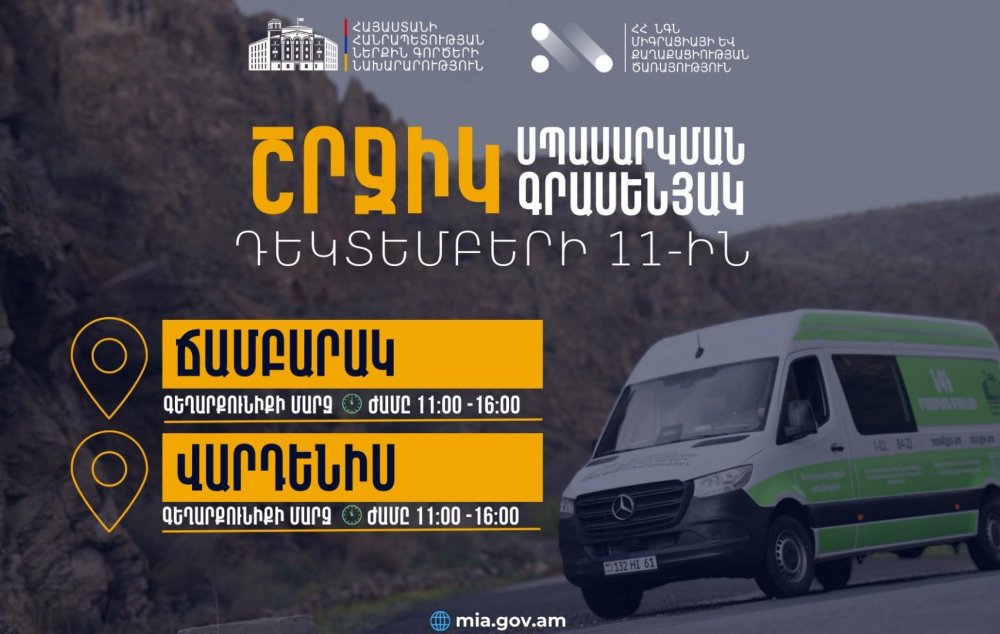 ժամը 11:00-16:00՝ Գեղարքունիքի մարզի Վարդենիս համայնքում՝ համայնքապետարանի հարևանությամբ։