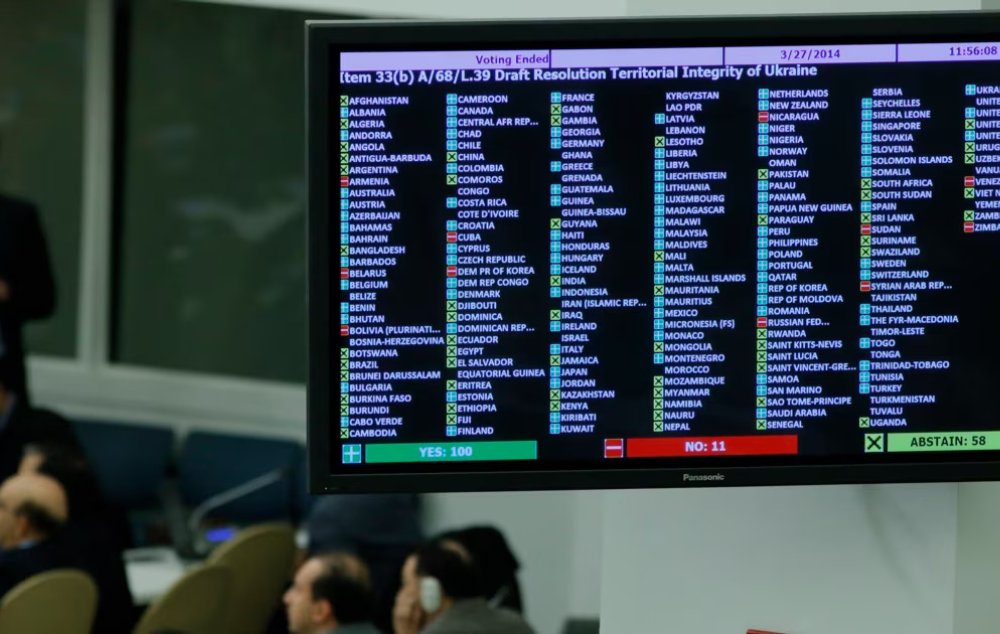 ՄԱԿ-ի Գլխավոր ասամբլեան ընդունել է նորացված բանաձև՝ Ռուսաստանի վերահսկողության տակ գտնվող Ուկրաինայի տարածքներում, այդ թվում՝ Ղրիմում և Սևաստոպոլում, մարդու իրավունքների վիճակի վերաբերյալ։ Укринформ -ի տվյալներով՝ ՄԱԿ-ի 79 անդամ պետություն կողմ է քվեարկել բանաձևին, 16-ը՝ դեմ, իսկ 73-ը՝ ձեռնպահ։ Բանաձևի հակառակորդների թվում են եղել Ռուսաստանը, Բելառուսը, Չինաստանը, Իրանը, Հյուսիսային Կորեան, Կուբան, Նիկարագուան և մի քանի աֆրիկյան երկրներ։ Հայաստանը ձեռնպահ է քվեարկել։