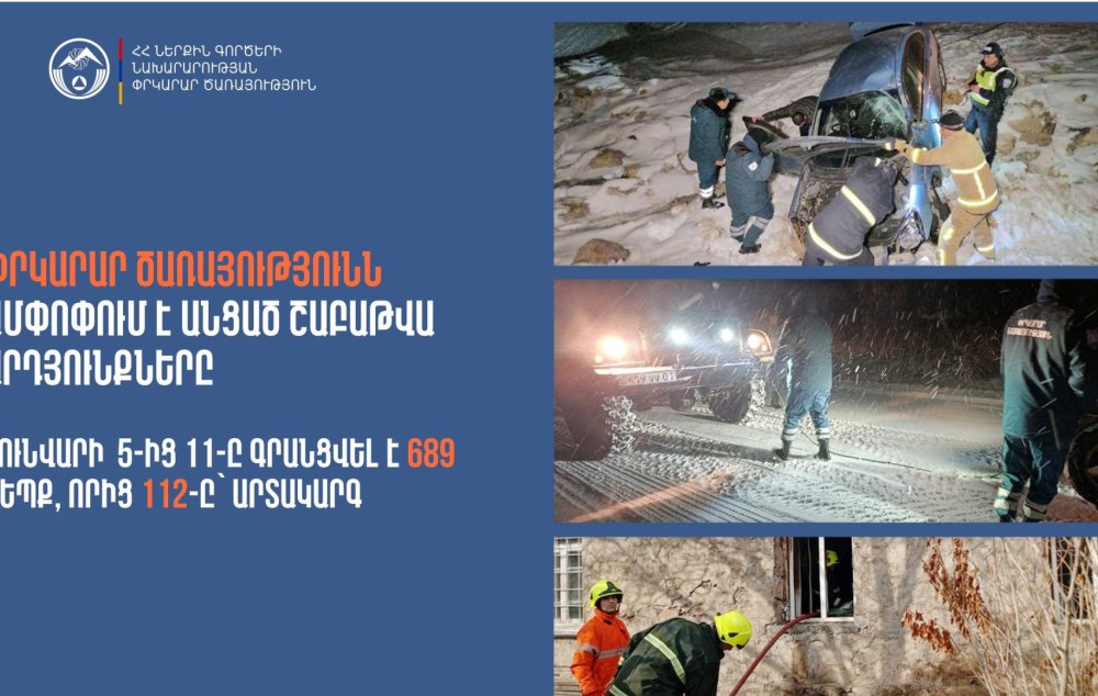 Հունվարի 5-11-ը ՆԳՆ ՓԾ ճգնաժամային կառավարման ազգային կենտրոնում գրանցվել է 689 դեպք, որից 112-ը՝ արտակարգ: