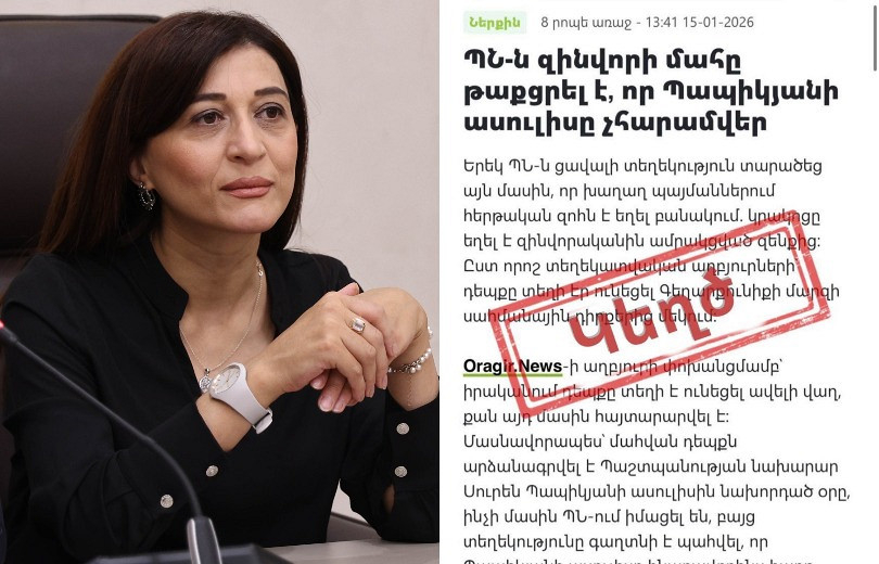 ԱԺ «Քաղաքացիական պայմանագիր» խմբակցության պատգամավոր Արփի Դավոյանը «Ֆեյսբուք»-ի իր էջում անդրադարձել է հայկական որոշ լրատվամիջոցների կողմից զինառայողի մահվան դեպքը թաքցնելու կեղծ տեղեկությունների հրապարակմանը: