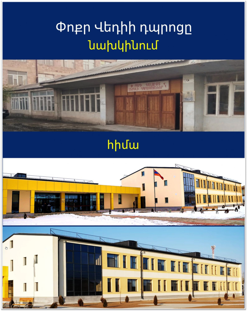 ՀՀ վարչապետի աշխատակազմի ղեկավարի տեղակալ Տարոն Չախոյանը Ֆեյսբուքի իր էջում հրապարակել է Փոքր Վեդիի դպրոցի նախկին և ներկա շենքերի լուսանկարները՝ գրելով․