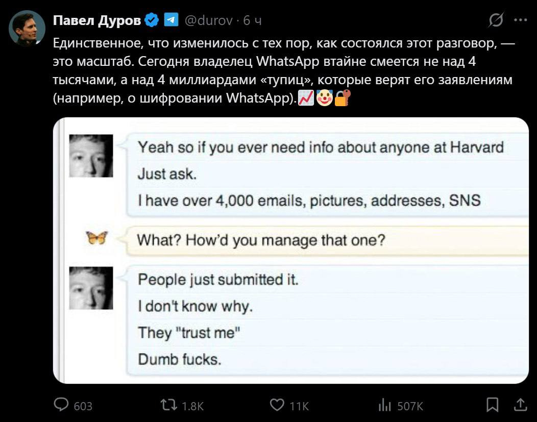 Meta ընկերության (որին պատկանում է WhatsApp-ը) հիմնադիր Մարկ Ցուկերբերգը ծիծաղում է այն օգտատերերի վրա, ովքեր վստահում են հավելվածի անվտանգության մասին նրա խոսքերին։ Այս մասին X սոցիալական ցանցում գրել է Telegram-ի հիմնադիր Պավել Դուրովը։