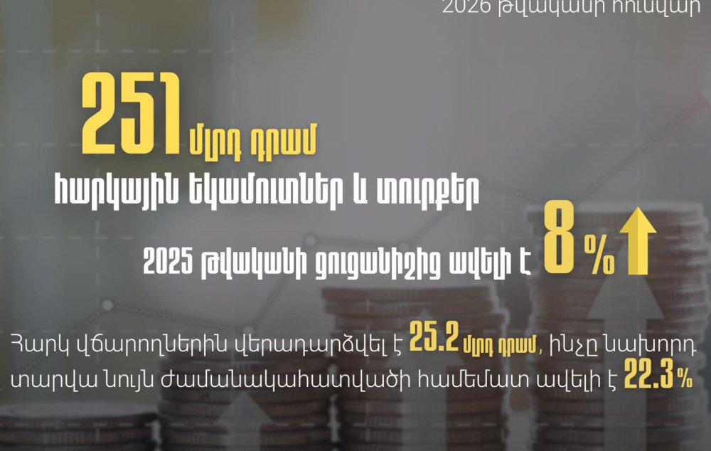 «Միաժամանակ, նույն ամսում հարկ վճարողներին վերադարձվել է 25.2 մլրդ դրամ գումար, ինչը 2025 թ. հունվարի համեմատ ավելի է 4.6 մլրդ դրամով կամ 22.3 %֊ով։