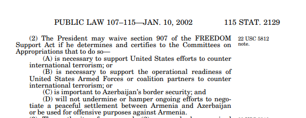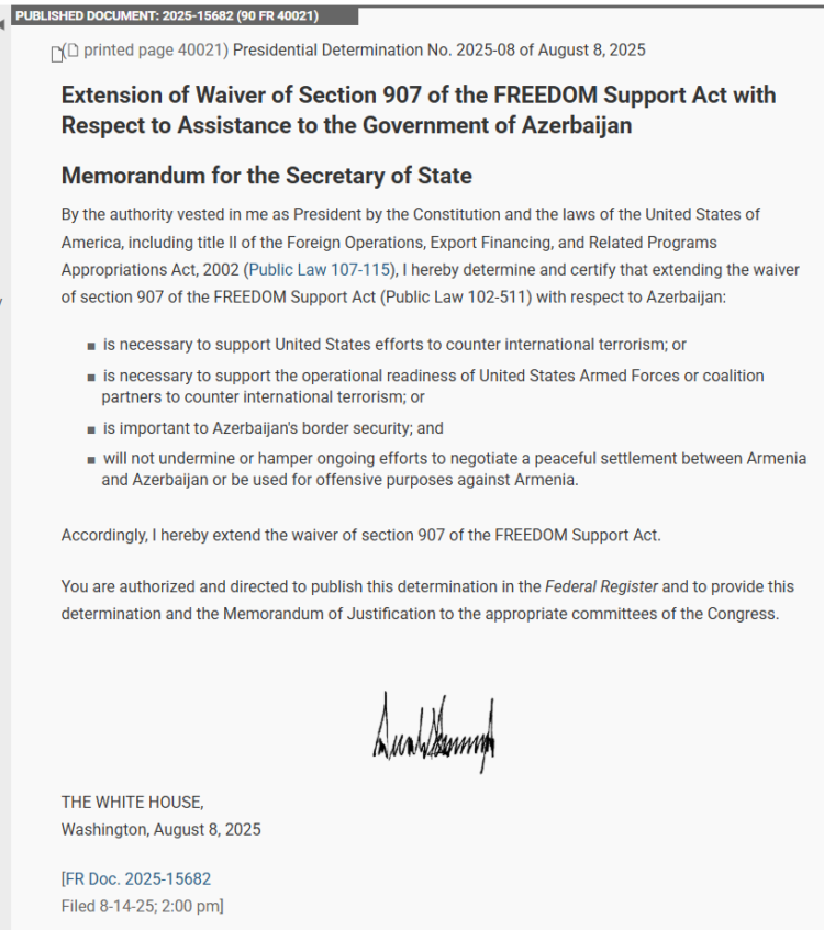 Հիշեցնենք, որ 2025 թվականի օգոստոսի 8-ին Սպիտակ տանը ԱՄՆ նախագահ Դոնալդ Թրամփը Ադրբեջանի նախագահ Իլհամ Ալիևի ներկայությամբ ստորագրեց Բաքվին ռազմական օգնության տրամադրումը սահմանափակող 907-րդ բանաձևի կասեցման ժամկետը երկարաձգելու մասին հուշագիրը։ Ավելի ուշ, դրա հրապարակված տեքստում նշվում էր, որ «բանաձևի կասեցումը չի խաթարի կամ չի խոչընդոտի Հայաստանի և Ադրբեջանի միջև խաղաղ կարգավորման բանակցությունների շարունակական ջանքերին և չի օգտագործվի Հայաստանի դեմ հարձակողական նպատակներով»։