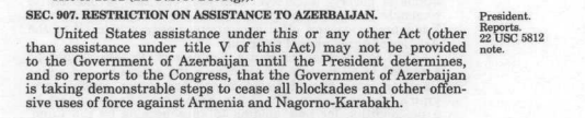 Այսպես, ԱՄՆ Կոնգրեսի կողմից բանաձևն ընդունվել է 1992 թվականին «Ազատության աջակցության ակտի» (Freedom Support Act) շրջանակում․ դրանով արգելվում էր ԱՄՆ դաշնային իշխանություններին ուղղակի ռազմական օգնություն տրամադրել Ադրբեջանի կառավարությանը, քանի դեռ Բաքուն իրական քայլեր չի ձեռնարկել դադարեցնելու Հայաստանի ու Լեռնային Ղարաբաղի դեմ կիրառվող շրջափակումն ու ուժի կիրառումը։