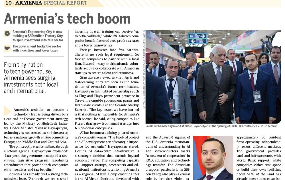 Հայաստանի տեխնոլոգիական ոլորտի զարգացման ռազմավարությունը, արձանագրված առաջընթացն ու առաջիկա նպատակները պարբերականի հետ զրույցում ներկայացրել է ՀՀ բարձր տեխնոլոգիական արդյունաբերության նախարար Մխիթար Հայրապետյանը՝ ընդգծելով, որ երկիրը քայլ առ քայլ վերածվում է տարածաշրջանային տեխնոլոգիական հանգույցի։
