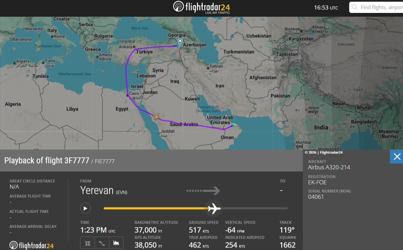 «Ֆլայուան Արմենիայի» Երեւան-Մասկատ հատուկ չվերթը (չվերթի համարը՝ 3F 7777) բավական երկար է տեւել՝ շուրջ 6 ժամ: Իրանի, Իրաքի ու Պարսից ծոցի մյուս երկրների փակ օդային սահմանների պայմաններում EK-FOE-ն ստիպված է եղել շրջանցել տարածաշրջանը՝ անցնելով Հայաստան-Թուրքիա-Կիպրոս-Եգիպտոս-Սաուդյան Արաբիա-Օման երթուղով: Ըստ թռիչքներին առցանց հետեւող flightradar24.com կայքի՝ 13:51-ին Երեւանից մեկնած օդանավը Մասկատ է հասել Երեւանի ժամանակով 19:42-ին: