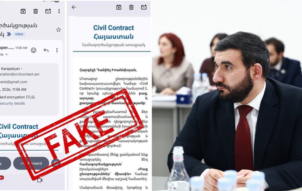 «Քաղաքացիական պայմանագիր» կուսակցության վարչության փոխնախագահ Վահագն Ալեքսանյանը տեղեկացնում է քաղաքացիներին, մեդիայի և ՀԿ ներկայացուցիչներին, որ վերջին օրերին դեռևս անհայտ խաբեբաներ «Քաղաքացիական պայմանագիր» կուսակցության դոմեյնին շատ նման civilcontact.am (իրականը՝ civilcontRact.am) դոմեյնով էլ.փոստ են բացել ու Կուսակցության և պատգամավոր Մարիա Կարապետյանի անունից նամակներ են ուղարկում տարբեր անձանց։
