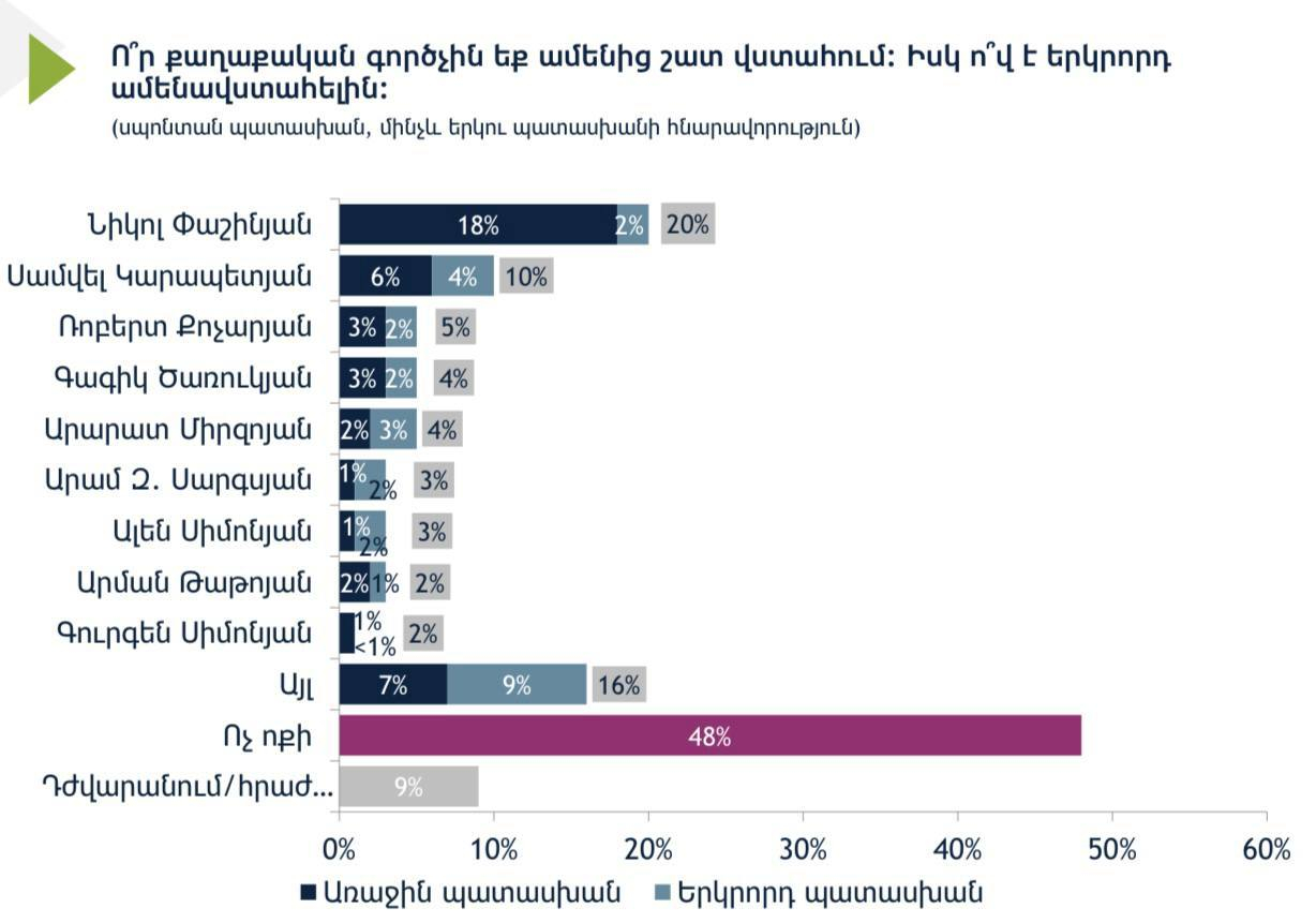 «Ո՞ր քաղաքական գործչին եք ամենից շատ վստահում» հարցը տոկոսային հարաբերությամբ հետևյալ պատկերն ունի․