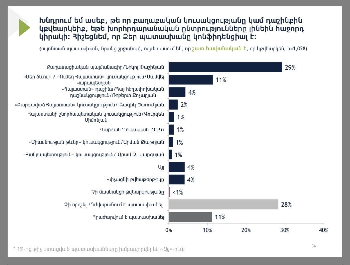 Որ կուսակցությանը կամ դաշինքին կքվեարկեիք, եթե խորհրդարանական ընտրությունները լինեին հաջորդ կիրակի։ Միջազգային հանրապետական ինստիտուտի կողմից ՀՀ-ում իրականացված հանրային կարծիքի ուսումնասիրության արդյունքներով քաղաքական ուժերը ստացել են հետևյալ տոկոսային հարաբերակցությունը՝