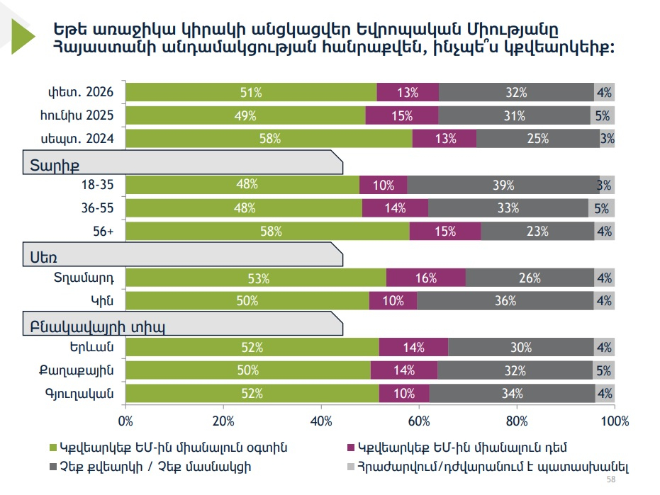 «Եթե առաջիկա կիրակի անցկացվեր Եվրոպական միությանը Հայաստանի անդամակցության հանրաքվեն, ինչպե՞ս կքվեարկեիք» հարցին Միջազգային հանրապետական ինստիտուտի Հարցումների հետազոտության կենտրոնի տվյալների համաձայն՝ քաղաքացիների կեսից ավելին պատասխանել է, որ կքվեարկեր ԵՄ-ին միանալու օգտին: Հարցումն անցկացվել է 2026 թվականի փետրվարին: