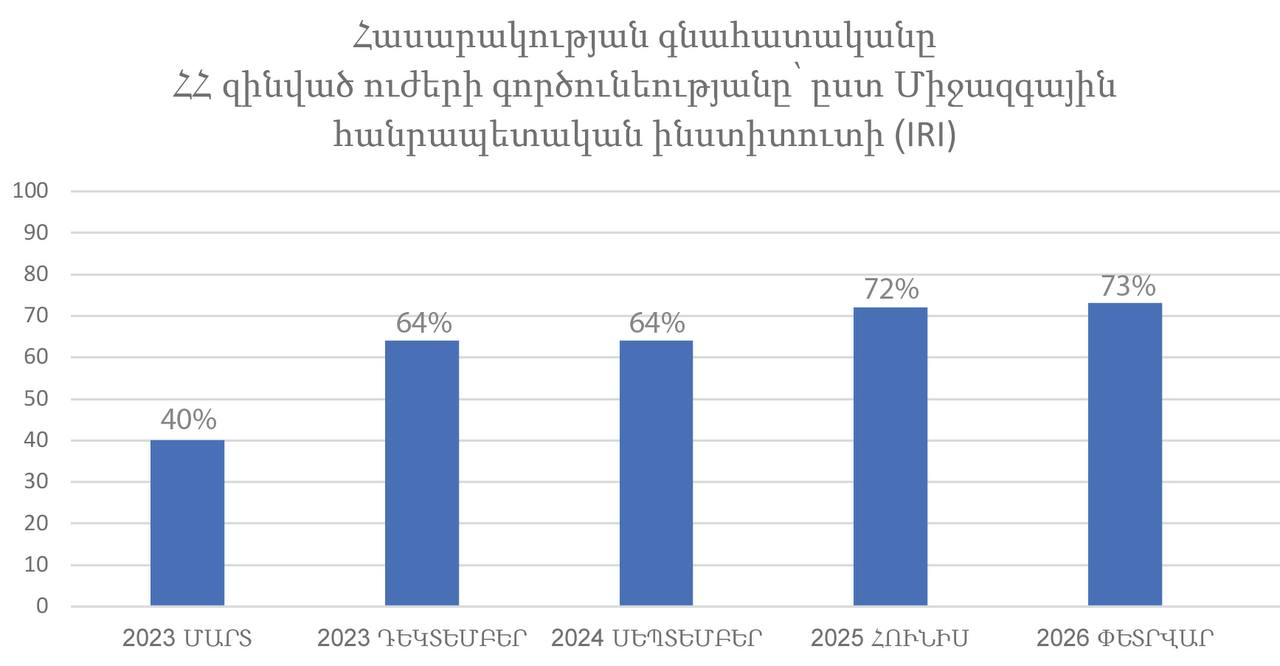 Հիշեցնենք, որ 2023 թվականի մարտին զինված ուժերի գործունեությունից գոհ է եղել հարցվածների 40 %-ը, 2024 թվականի սեպտեմբերին՝ 64 %-ը, 2025 թվականի հունիսին՝ 72 %-ը։