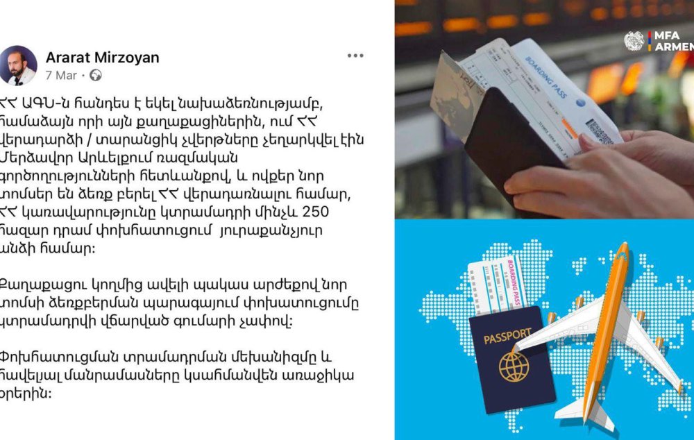 «Ինչպես ավելի վաղ հայտնել էր ՀՀ ԱԳ նախարար Արարատ Միրզոյանը՝ ՀՀ ԱԳ նախարարությունը հանդես է եկել նախաձեռնությամբ, համաձայն որի այն քաղաքացիներին, ում ՀՀ վերադարձի ուղիղ կամ տարանցիկ չվերթները չեղարկվել էին պայմանավորված Մերձավոր Արևելքում ստեղծված իրավիճակով, և ում համար ավիաընկերությունը նոր տոմս չի ապահովել և իրենք են գնել ՀՀ վերադարձի նոր տոմսը, ՀՀ կառավարությունը կտրամադրի մինչև 250 հազար դրամ փոխհատուցում յուրաքանչյուր անձի համար։