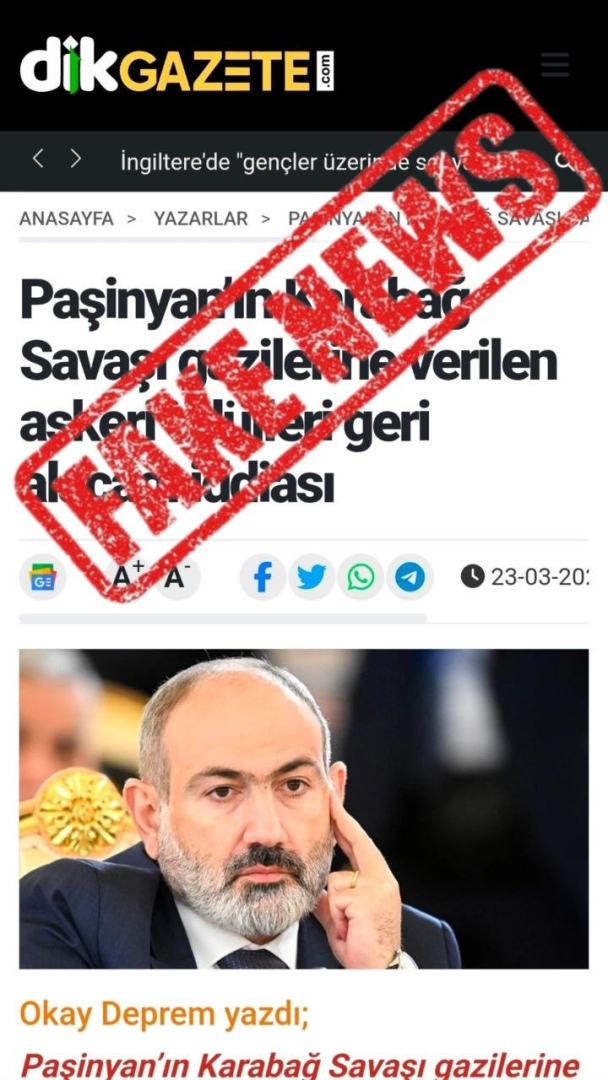 «Dikgazete.com կայքում հրապարակվել է հերթական ապատեղեկատվությունը, ըստ որի՝ իբր ՀՀ կառավարությունը մտադիր է վերանայել և հետ վերցնել Ղարաբաղյան պատերազմի մասնակիցներին տրամադրված պարգևները։ Նշված պնդումը ամբողջությամբ կեղծ է և որևէ առնչություն չունի իրականության հետ»։Այս մասին սոցցանցի իր էջում տեղեկացրել է ՀՀ վարչապետի մամուլի քարտուղար Նազելի Բաղդասարյանը։