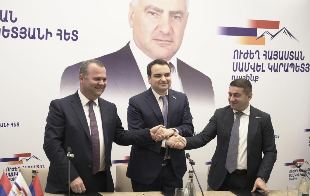 Մարտի 31-ին «Ուժեղ Հայաստան» կուսակցության քաղաքական խորհրդի անդամ Նարեկ Կարապետյանը դաշինքի ձևավորման մասին համաձայնագիր է ստորագրել «Նոր դարաշրջան» կուսակցության նախագահ Հարություն Հարությունյանի և «Միավորված հայեր» կուսակցության պատվավոր նախագահ, լիազոր ներկայացուցիչ Նաիրի Սարգսյանի հետ։