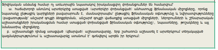 ա․ հաճախորդի անունով արտերկրից ստացված (արտերկիր փոխանցված) անհատույց ֆինանսական միջոցները, որոնց նպատակը ընթացիկ կարիքների բավարարումն է, մասնավորապես՝ ընթացիկ ֆինանսական օգնությունը և նվիրատվությունները, նպաստները, թոշակները և այլ նմանատիպ միջոցները,