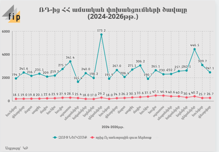 Ամսական վիճակագրության վերլուծության համար հիմք ենք ընդունել վերջին 26 ամիսներին իրականացված փոխանցումների ծավալը (2024-2025 թթ. և 2026 թ. հունվար-փետրվար ամիսների տվյալները):