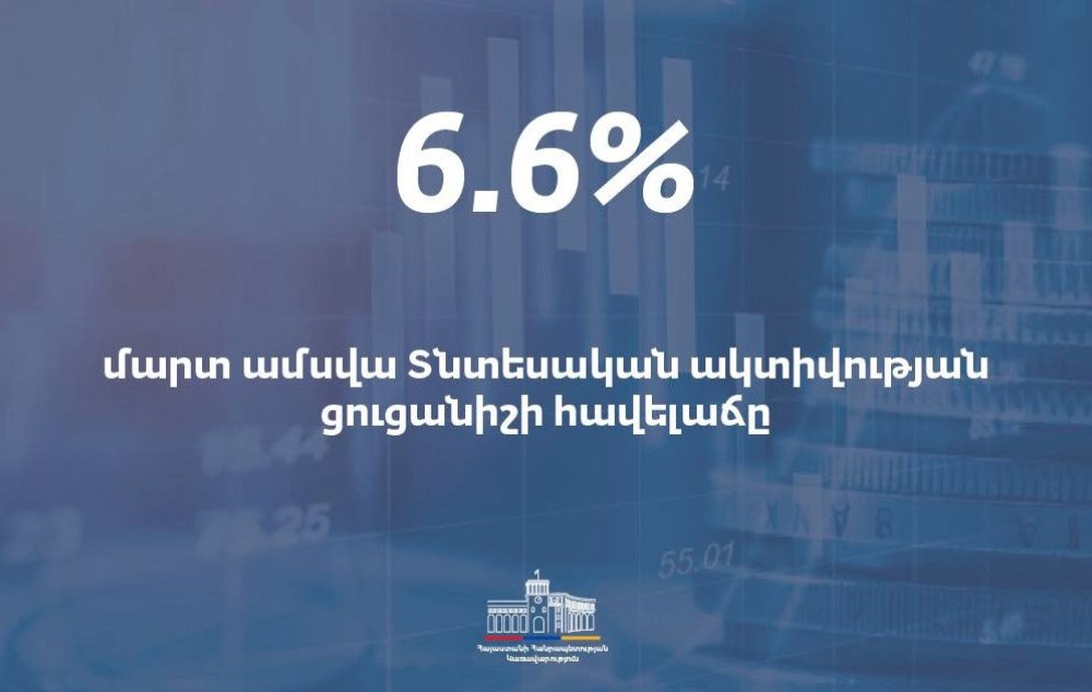 2026 թ. մարտին նախորդ տարվա նույն ամսվա համեմատ Հայաստանում տնտեսական ակտիվության ցուցանիշի (ՏԱՑ) հավելաճը կազմել է 6.6%, իսկ նախորդ ամսվա համեմատ՝ 11.6%: Այս մասին տեղեկացնում են Կառավարության մամուլի ծառայությունից: