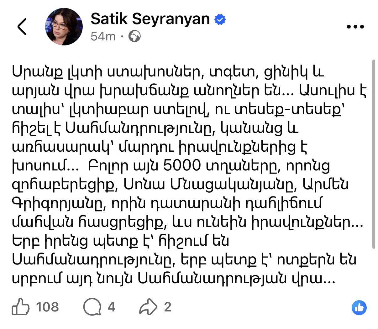 «Հայելու մե՞ջ ես նայել, տիկի՛ն Սեյրանյան, թե՞ արդեն մրմուռը խեղդում է ամեն բանից: Տգետ ասելիս նաև աշխատանքիդ որակը նայի, որ մեռցրել ես, ցինիկ արյան վրա խրախճանքի մեծ օրինակ ես, 3833 զոհը 5000 ասելն է, արյան խրախճանք, լկտիությունը Սոնա Մնացականյանի կամ Արմեն Գրիգորյանի անունը օգտագործելն է քո ցածր նպատակների համար: