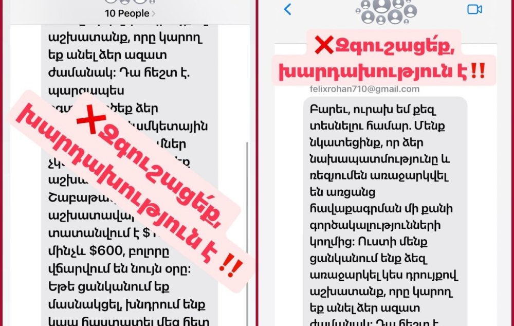Վերջին օրերին բազմաթիվ քաղաքացիներ հայկական հեռախոսահամարներից ստացել են SMS հաղորդագրություններ, որոնցով նրանց առաջարկել են առցանց աշխատանք՝ խոստանալով բարձր եկամուտ։