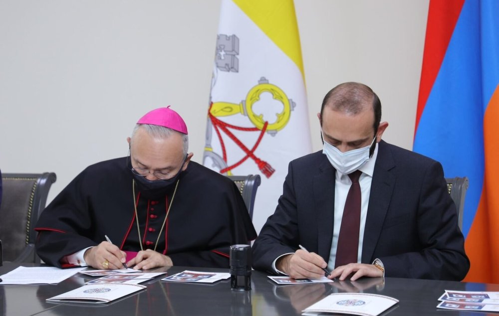 ՀՀ ԱԳ նախարար Արարատ Միրզոյանը և Սուրբ Աթոռի պետքարտուղարի ընդհանուր հարցերով փոխանորդ Էդգար Պենյա Պառան մասնակցեցին «Հռոմի քահանայապետերի առաքելական այցերը Հայաստան. Ուխտագնացություն առաջին քրիստոնյա երկիր» թեմայով երկու նամականիշով գեղաթերթիկի մարման արարողությանը։