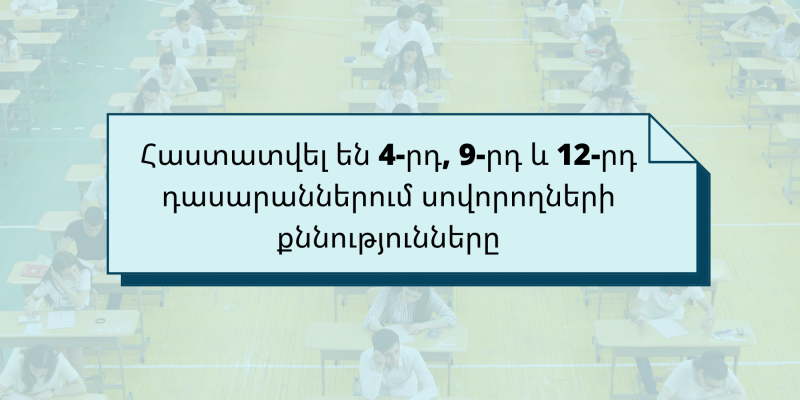 - 9-րդ դասարանում ավարտական, կենտրոնացված ավարտական քննական թեստերի առաջադրանքները կազմում է ԳԹԿ-ն, առաջադրանքներն ընտրվում են ԿԳՄՍ նախարարության կողմից երաշխավորված և դպրոցում գործածվող դասագրքերից կամ ձեռնարկներից: