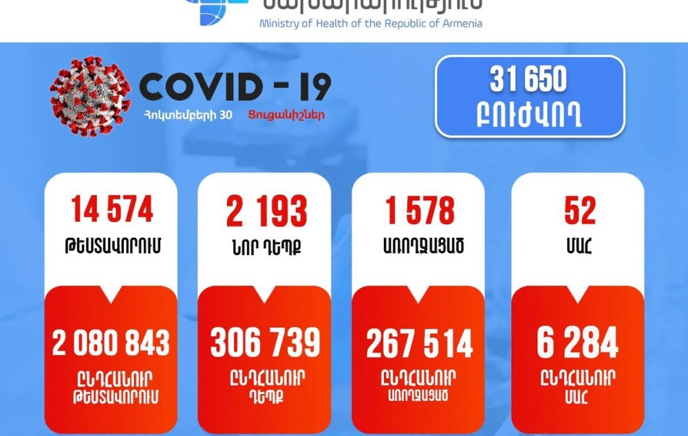 2193 նոր դեպք, 52 մահ. կորոնավիրուսային իրավիճակը Հայաստանում