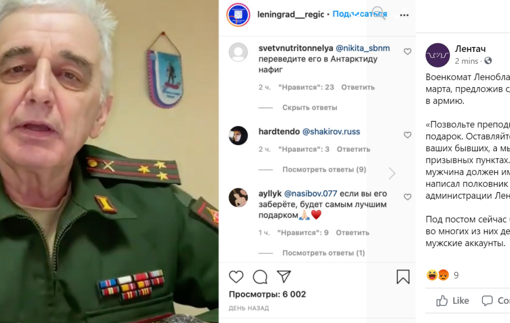 Լենինգրադի մարզի զինկոմիսարիատը Ինստագրամի էջում շնորհավորել է կանանց մարտի 8-ի կապակցությամբ և առաջարկել մեկնաբանություններում նշել իրենց նախկիններին ու խոստացել, որ նրանց կդիմավորեն զորակոչային կետերում։ Գրառման տակ արդեն 400-ից ավելի մեկնաբանություն կա, կանայք, կարծես իրոք նշում են նախկիններին։