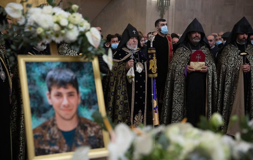 Այսօր հավաքվել ենք Երևանի Սուրբ Գրիգոր Լուսավորիչ մայր եկեղեցու խնկաբույր կամարների ներքո՝ դեպի հավերժություն ճանապարհելու հայրենիքի պաշտպանության համար նահատակված մեր քաջազուն որդիներին: Մեր խիզախ զինվորների նվիրական մասունքների առջև խոնարհում ենք բերում նրանց լուսավոր հիշատակին, հիշում նրանց արիությունն ու սխրանքները: Հրաժեշտի այս պահին վերհիշում ենք արցախյան պատերազմի ողբերգական իրադարձությունները, մեր ողջ պատմության ընթացքում մեզ պատուհասած աղետներն ու արհավիրքները, գոտեպնդվում փորձություններին դիմակայելու մեր ժողովրդի զավակների զորեղ կամքով, աննկուն տոկունությամբ ու վճռականությամբ։