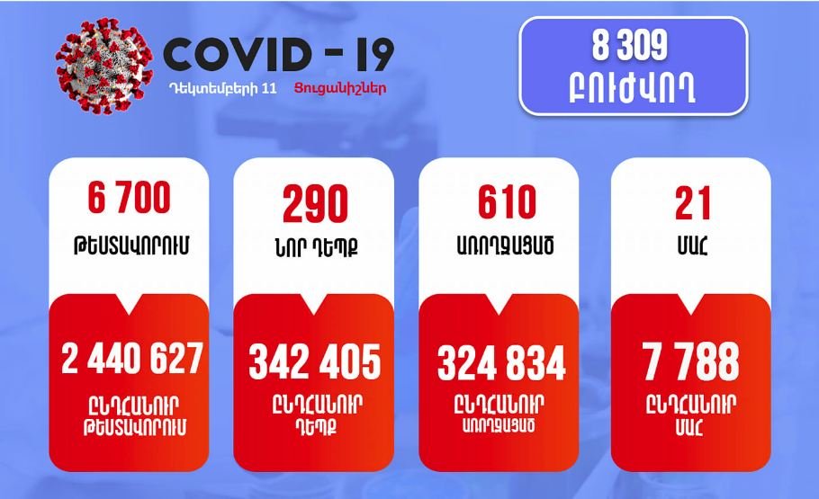 Դեկտեմբերի 11-ին՝ ժ. 11:00 դրությամբ, հանրապետությունում հաստատվել է կորոնավիրուսի 290 նոր դեպք: Մեկ օրում իրականացվել է 6700 թեստավորում: Առողջացել է 610 պացիենտ, արձանագրվել է մահվան 21 դեպք: