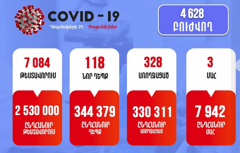 Դեկտեմբերի 25-ին՝ ժ. 11:00 դրությամբ, Հայաստանում հաստատվել է կորոնավիրուսի 118 նոր դեպք: Մեկ օրում իրականացվել է 7084 թեստավորում: Առողջացել է 328 քաղաքացի, մահացել 3 պացիենտ: