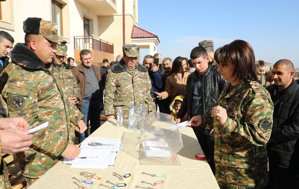 Նոր բնակարանների վկայագրերը անձամբ հասցեատերերին է հանձնել և շնորհավորանքի խոսքեր ուղղել ԱՀ ՊՆ, ՊԲ հրամանատար, գեներալ-լեյտենանտ Կամո Վարդանյանը: