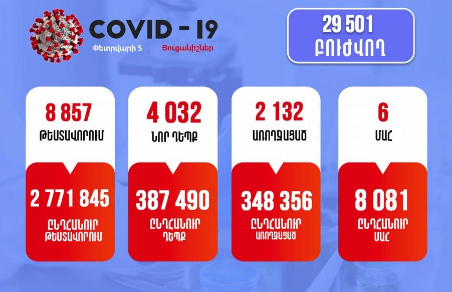 Փետրվարի 5-ին` ժամը 11:00-ի դրությամբ, Հայաստանում արձանագրվել է կորոնավիրուսային հիվանդության 4032 նոր դեպք, կատարվել է 8857 թեստավորում, առողջացել է 2132 քաղաքացի, արձանագրվել է 6 մահվան դեպք: