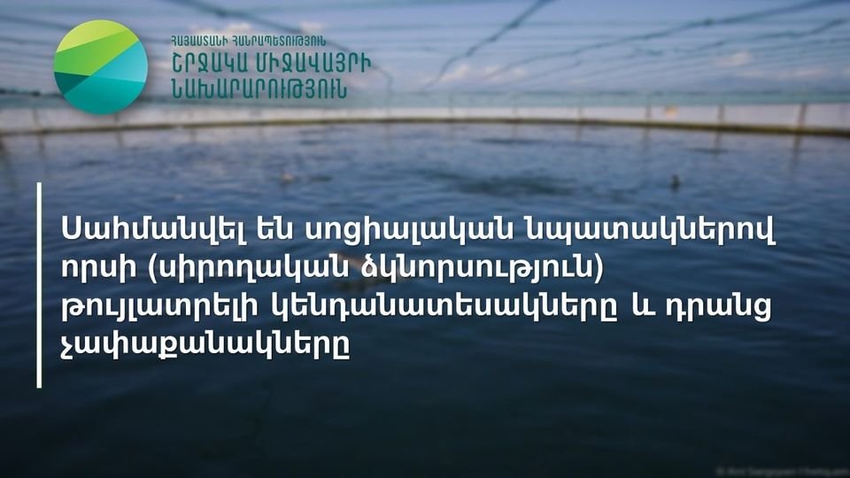 Հիմք ընդունելով «Որսի և որսորդական տնտեսության վարման մասին» Հայաստանի հանրապետության օրենքի 5-րդ հոդվածի 2-րդ մասը, 8-րդ հոդվածի 1-ին մասի 8-րդ կետը, սահմանվել է սոցիալական նպատակներով որսի (սիրողական ձկնորսություն) հետևյալ կենդանատեսակները և դրանց չափաքանակները, որոնց կարող եք ծանթանալ հետևյալ հղմամբ՝