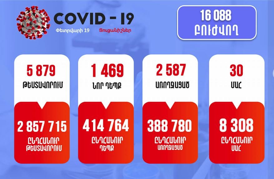 Փետրվարի 19-ի ժամը 11:00-ի դրությամբ Հայաստանում արձանագրվել է կորոնավիրուսի 1469 նոր դեպք, իրականացվել է 5879 թեստավորում: Առողջացել է 2587 քաղաքացի, գրանցվել է մահվան 30 դեպք: