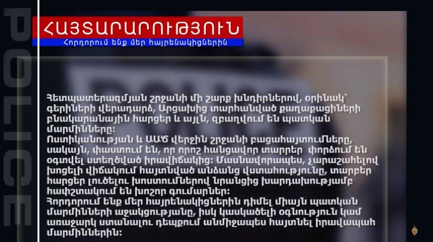 Ոստիկանության և ԱԱԾ վերջին շրջանի բացահայտումները, սակայն, փաստում են, որ որոշ հանցավոր տարրեր փորձում են օգտվել ստեղծված իրավիճակից։ Մասնավորապես, չարաշահելով խոցելի վիճակում հայտնված անձանց վստահությունը, տարբեր հարցեր լուծելու խոստումներով նրանցից խարդախությամբ հափշտակում են խոշոր գումարներ։
