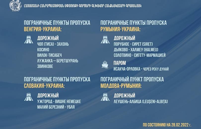 Ուկրաինայից դուրս մեկնել ցանկացող ՀՀ քաղաքացիների համար Սփյուռքի գլխավոր հանձնակատարի գրասենյակը ներկայացրել է սահմանային անցակետերի վերաբերյալ անհրաժեշտ տեղեկատվություն: