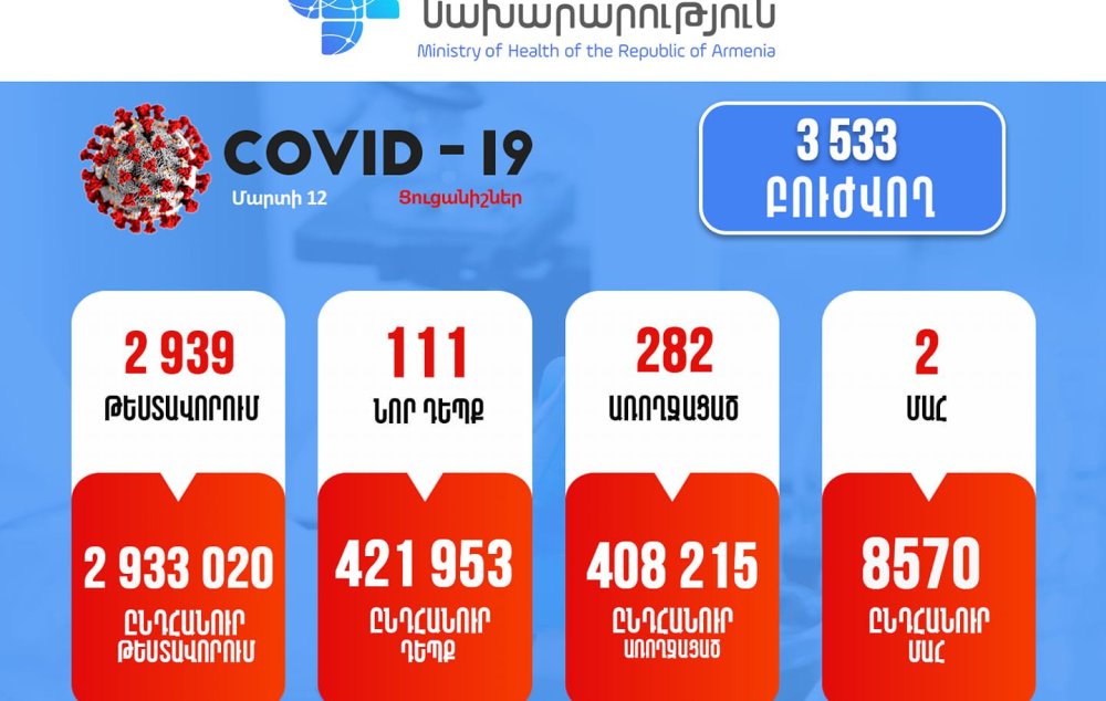 Մարտի 12-ին՝ ժամը 11:00-ի դրությամբ, հանրապետությունում հաստատվել է կորոնավիրուսային հիվանդության 111 նոր դեպք: Իրականացվել է 2939 թեստավորում, առողջացել է 282 մարդ, գրանցվել է մահվան 2 դեպք: