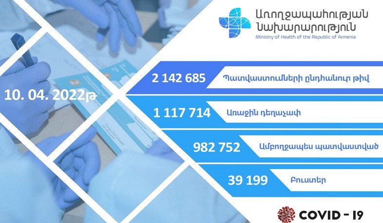 Հայաստանում պատվաստումային գործընթացը շարունակվում է: ՀՀ ԱՆ-ից հայտնում են, որ ապրիլի 10-ի դրությամբ կատարվել է 2 142 685 պատվաստում, որից`