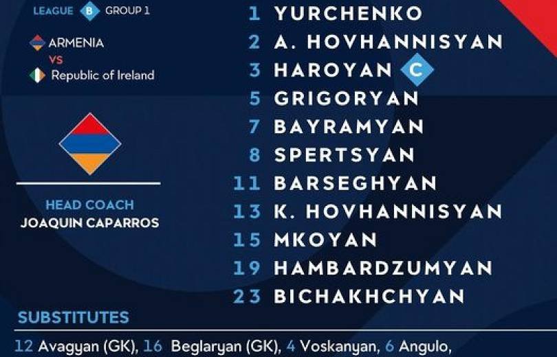ՀՖՖ-ն հրապարակել է Հայաստան-Իռլանդիա խաղի մեկնարկային կազմը: Այն կընթանա հետևյալ ֆուտբոլիստների մասնակցությամբ՝ Դավիթ Յուրչենկո, Արման Հովաննիսյան, Վարազդատ Հարոյան, Արտակ Գրիգորյան, Խորեն Բայրամյան, Տիգրան Բարսեղյան, Էդուարդ Սպերցյան, Կամո Հովհաննիսյան, Հրայր Մկոյան, Հովհաննես Համբարձումյան, Վահան Բիչախչյան: