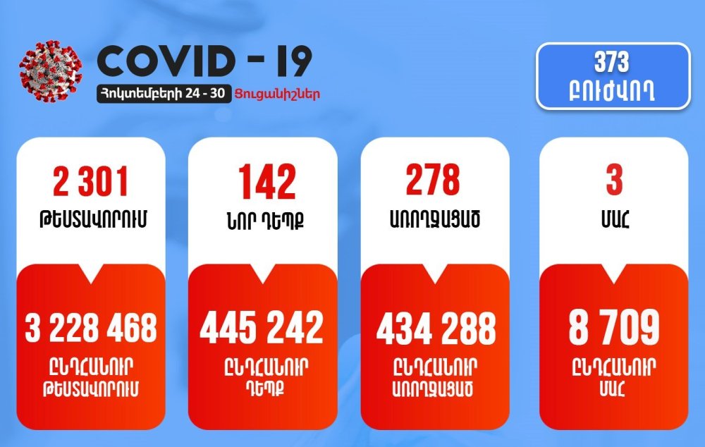 Հոկտեմբերի 24-30-ը Հայաստանում գրանցվել է կորոնավիրուսային հիվանդության 142 նոր դեպք, կատարվել է 2301 թեստավորում: Առողջացել է 278 բուժառու, արձանագրվել է մահվան 3 դեպք: