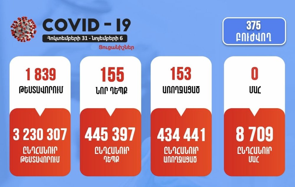 Հոկտեմբերի 31-ից նոյեմբերի 6-ը Հայաստանում գրանցվել է կորոնավիրուսային հիվանդության 155 նոր դեպք, կատարվել է 1839 թեստավորում: