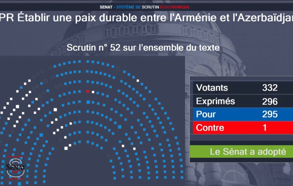 Քիչ առաջ Ֆրանսիայի Հանրապետության Սենատը 295 կողմ և 1 դեմ ձայների հարաբերակցությամբ ընդունեց Հայաստանին աջակցող և Ադրբեջանի նկատմամբ պատժմիջոցներ առաջարկող բանաձև․ տեղեկացնում են Ֆրանսիայում ՀՀ դեսպանությունից։