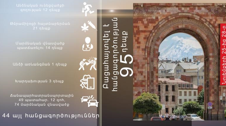 Ըստ ոստիկանության օպերատիվ հաղորդագրությունների ամփոփագրերի՝ նոյեմբերի 25-ից 28-ը Հայաստանի Հանրապետության ոստիկանության ստորաբաժանումները բացահայտել են հանցագործության 95 դեպք, որից 3-ը՝ նախկինում կատարված։