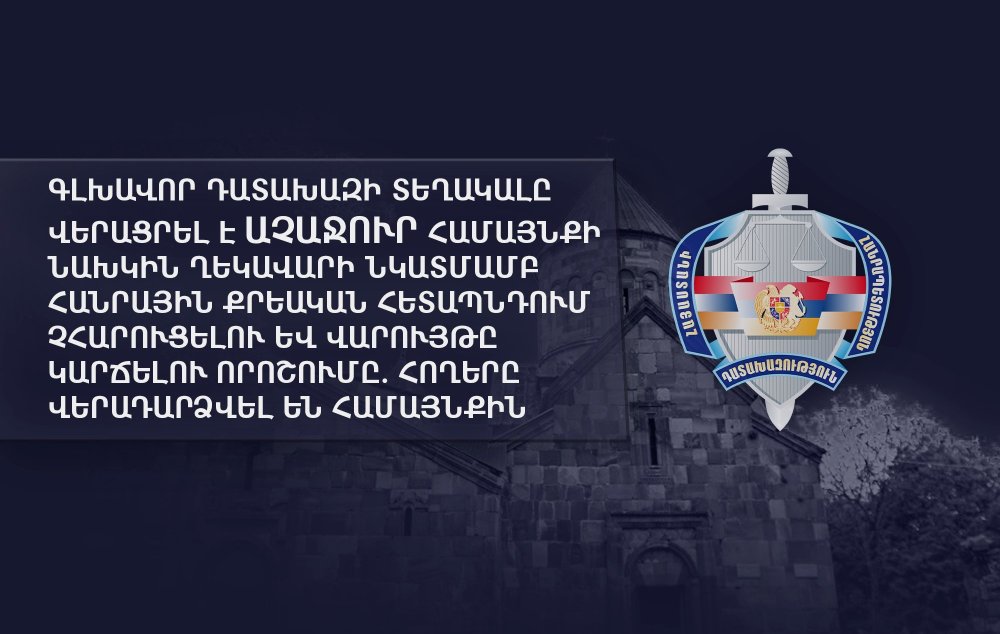 Գլխավոր դատախազի տեղակալը վերացրել է Աչաջուր համայնքի նախկին ղեկավարի նկատմամբ հանրային քրեական հետապնդում չհարուցելու և վարույթը կարճելու որոշումը. հողերը վերադարձվել են համայնքին